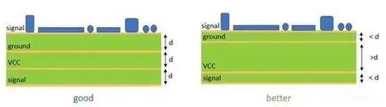 電源平面縮短了接地路徑,降低了電感,提高了電磁兼容性(EMC)性能。還應歸功于,兩側的電源平面還會產生一個平行板去耦電容器,從而防止了噪聲傳播。