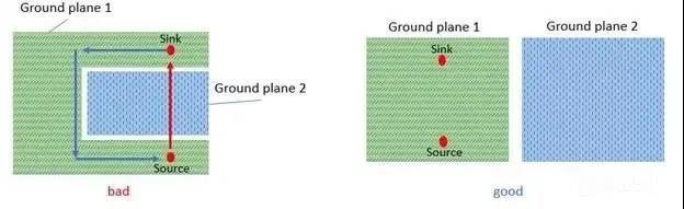 下圖顯示了兩個分開的接地平面的示例。在左側,返回電流無法沿著信號走線直接通過,因此會出現環路區域,而不會在右側環路區域進行設計。