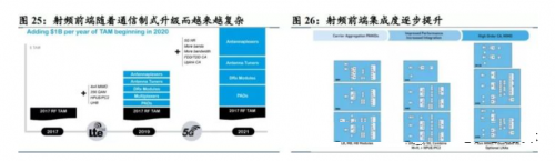 5G時代射頻前端模組化程度將越來越高。隨著通信制式升級,頻段變多,高一級的通信系統要向下兼容,導致射頻器件越來越多越來越復雜;同時要求增加電池容量, 壓縮手機無線充軟板廠的PCB板面積,決定了模組化是必然趨勢: