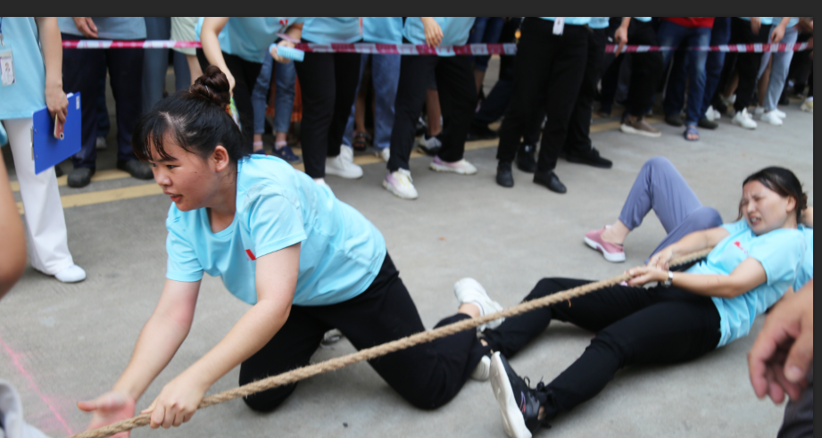 小姐姐們已經倒地了,但是裁判哨聲未響起,比賽還未結束,她們還在堅持抓著繩子,這就是深聯人的體育精神,永不言棄。
