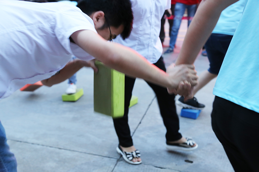 三人手雙腳交替踏在三塊河石上向前移動,雙腳不得著地,在規定的距離內用時少者勝。