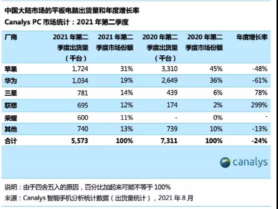 今年第二季度,中國大陸的平板電腦出貨量開始有了下降的跡象。Canalys 報告顯示,2021年第二季度中國大陸市場的 PC 總出貨量同比下降3%,環(huán)比增長13%,達到1940萬臺。其中,平板電腦的出貨量同比驟降24%。而在今年第一季度,中國平板電腦市場出貨量剛創(chuàng)下2013年第二季度以來的單季度最高同比增幅——同比增長達到67.6%。從上半年的出貨量排名來看,蘋果、華為、榮耀、聯(lián)想、三星依舊占據(jù)TOP 5。